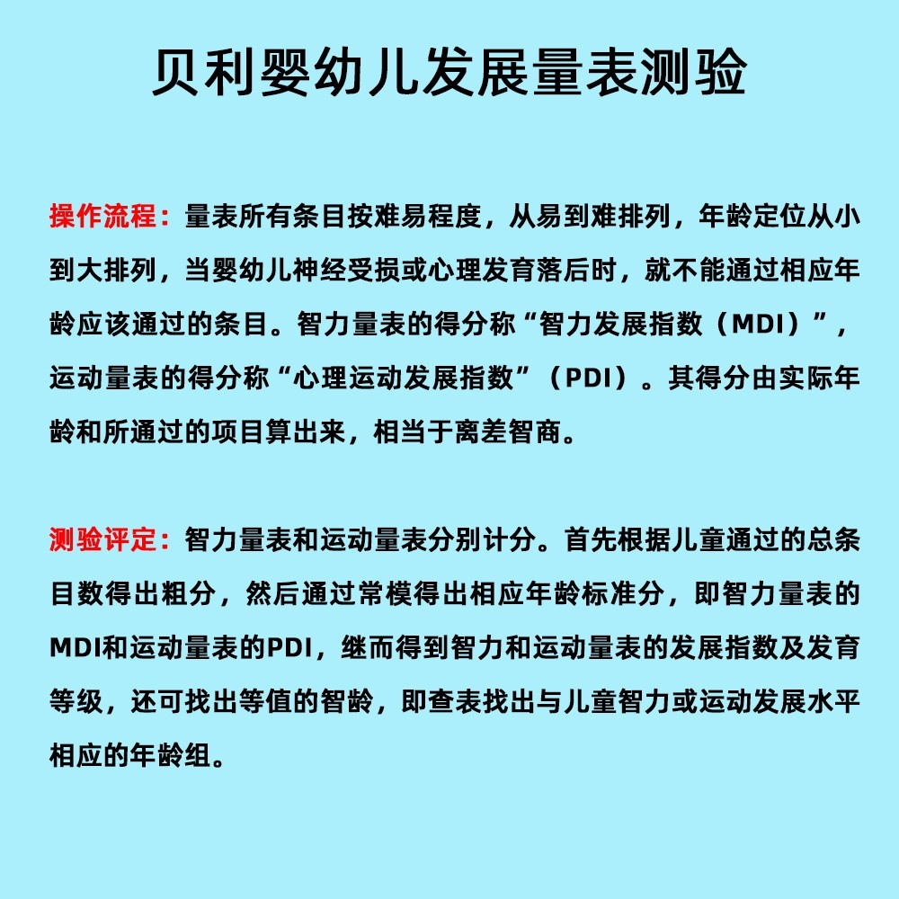 量表所有條目按難易程度,從易到難排列,年齡定位從小到大排列,當(dāng)嬰幼兒神經(jīng)受損或心理發(fā)育落后時,就不能通過相應(yīng)年齡應(yīng)該通過的條目。智力量表的得分稱“智力發(fā)展指數(shù)(MDI)”,運(yùn)動量表的得分稱“心理運(yùn)動發(fā)展指數(shù)”(PDI)。其得分由實(shí)際年齡和所通過的項(xiàng)目算出來,相當(dāng)于離差智商。